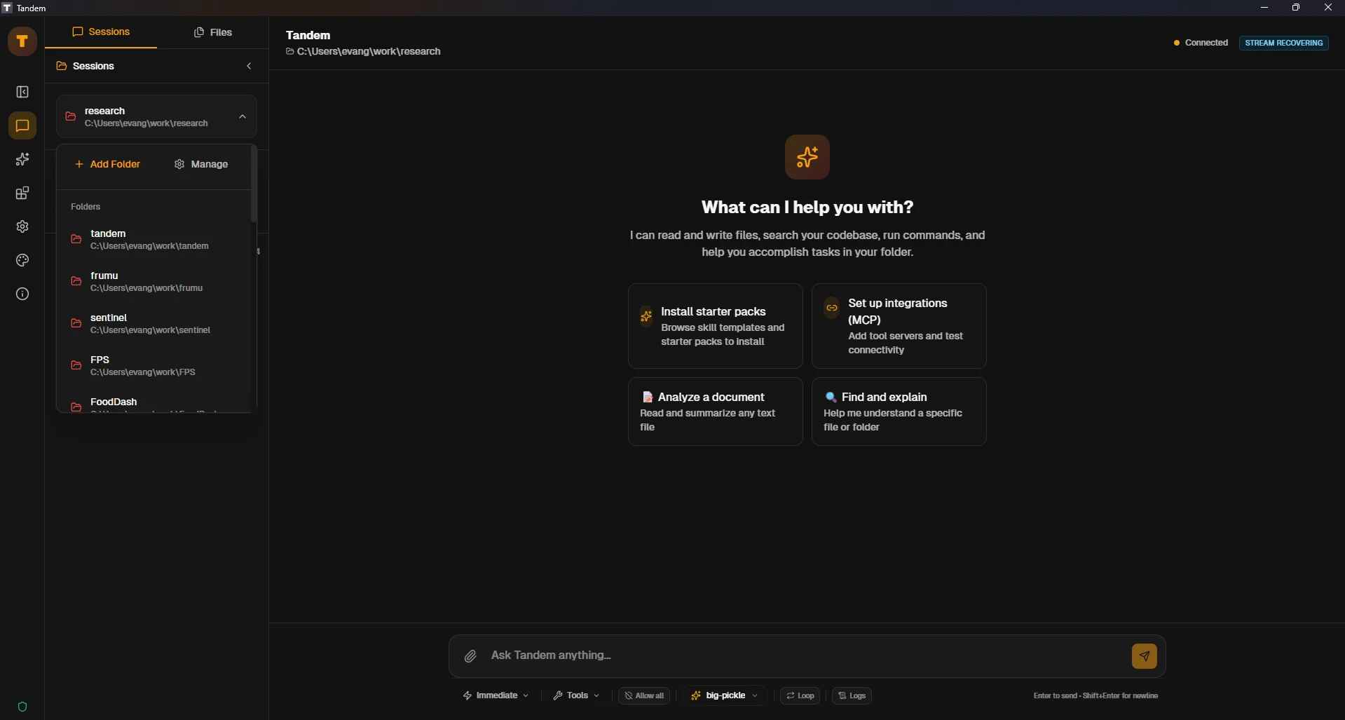 Tandem is local-first. It only works inside folders you explicitly choose, and AI responses require at least one configured provider or local model.